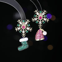 The first option features a golden-blue line butterfly tie dropping a pair of Christmas bells, creating a harmonious and enchanting design. The second option is an asymmetrical charm, with each earring showcasing a snowflake that drops a Christmas sock and a Christmas hat.
